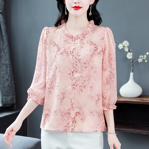 Mã L724: Áo sơ mi voan hoa nữ trung niên kiểu mới siêu đẹp độc đáo áo hồng tay lỡ