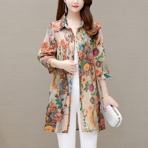 Mã L834: Áo sơ mi trung niên mỏng họa tiết hoa dài đến giữa dành cho nữ cao cấp
