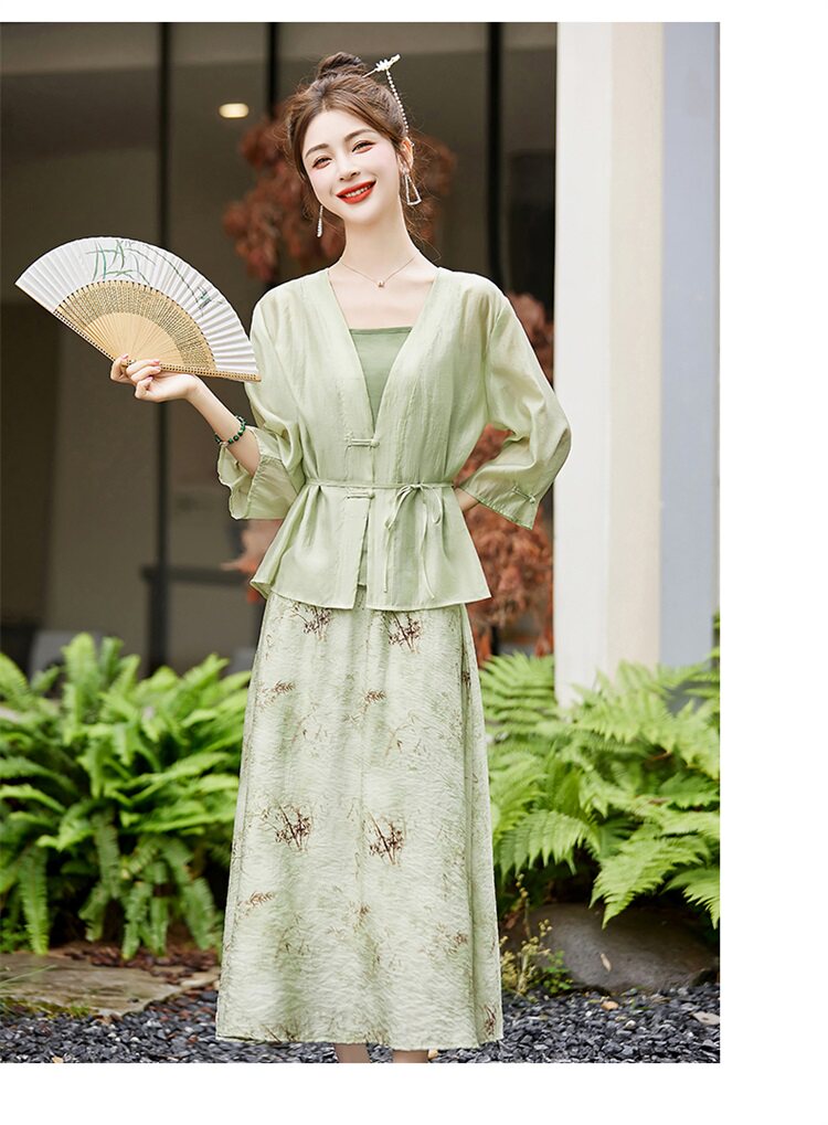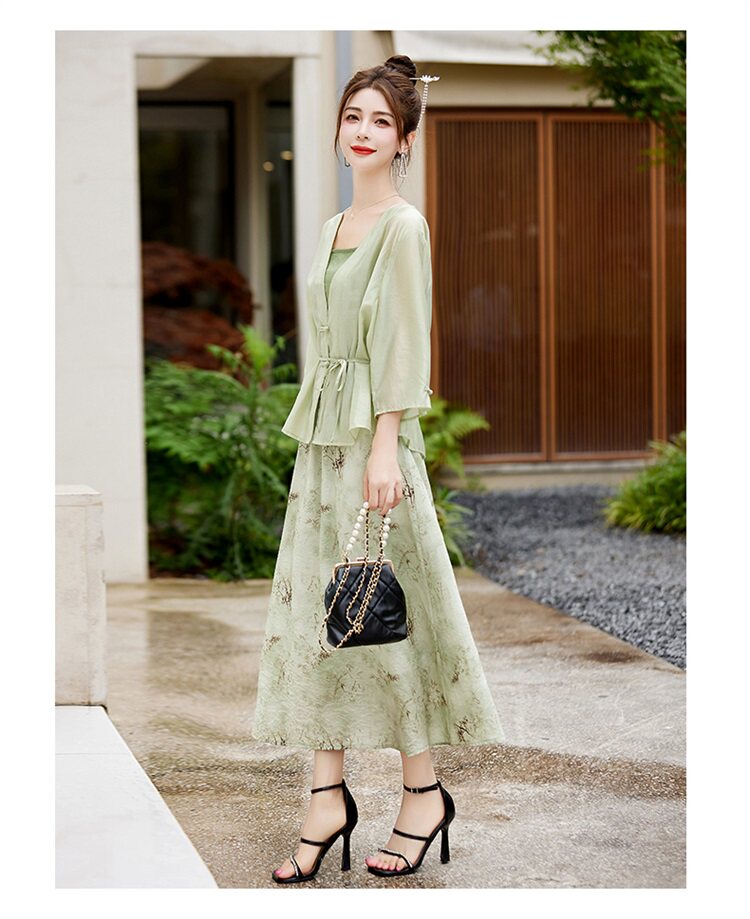 • Kiểu dáng: Sét váy 3 chi tiết gồm 1 áo hai dây + 1 khoác ngoài + 1 chân váy tone màu xanh - be nhẹ nhàng thanh lịch , thiết kế đẹp mắt, thanh lịch mặc đi chơi đi làm đều phù hợp