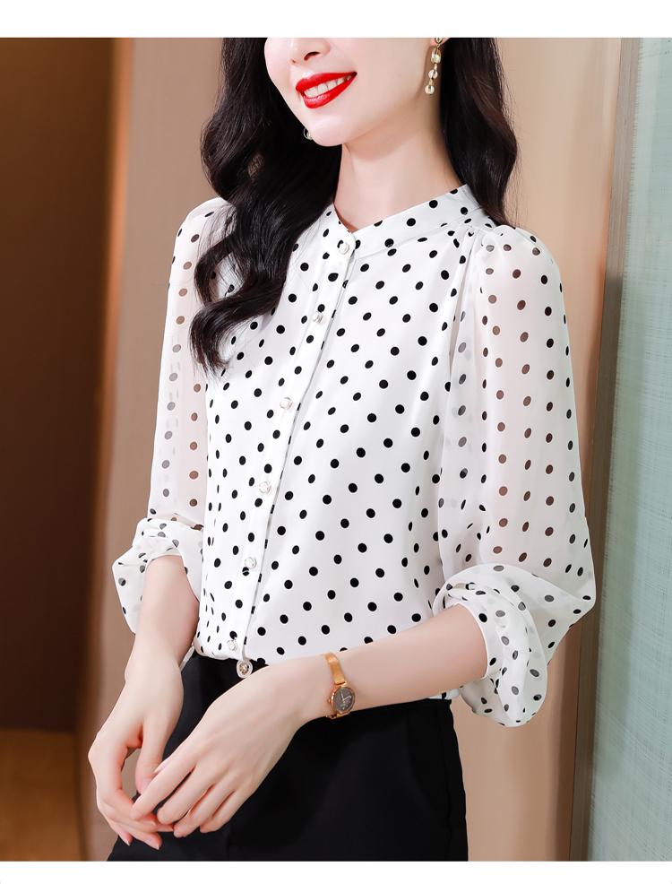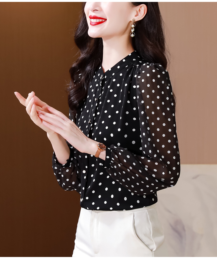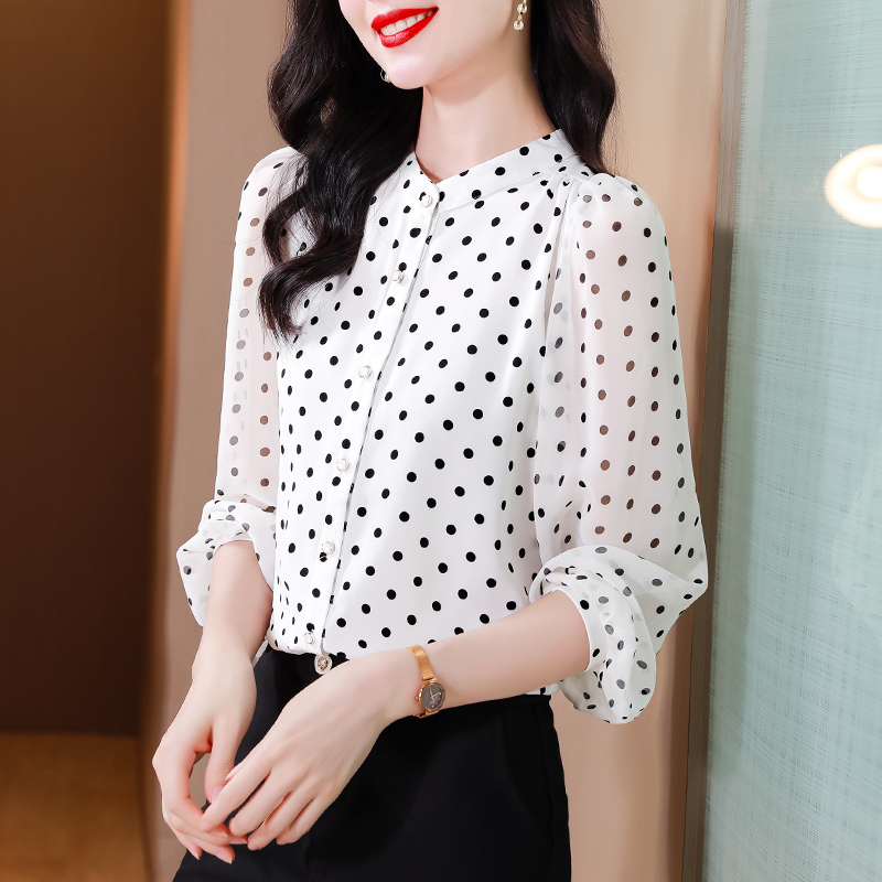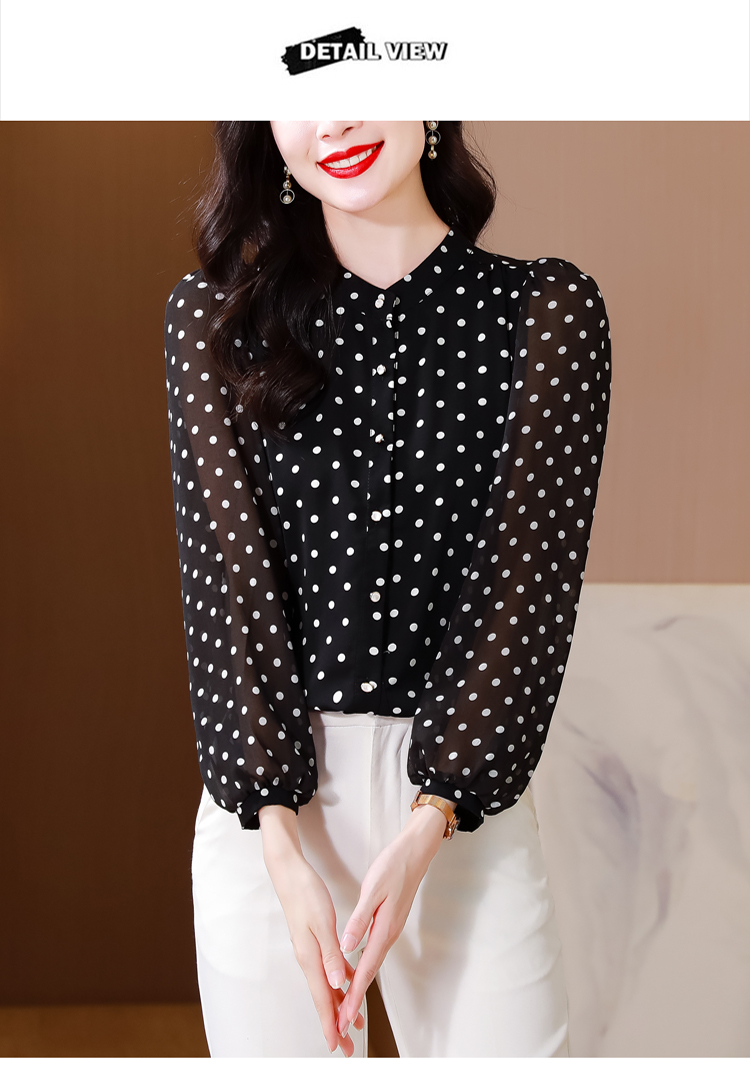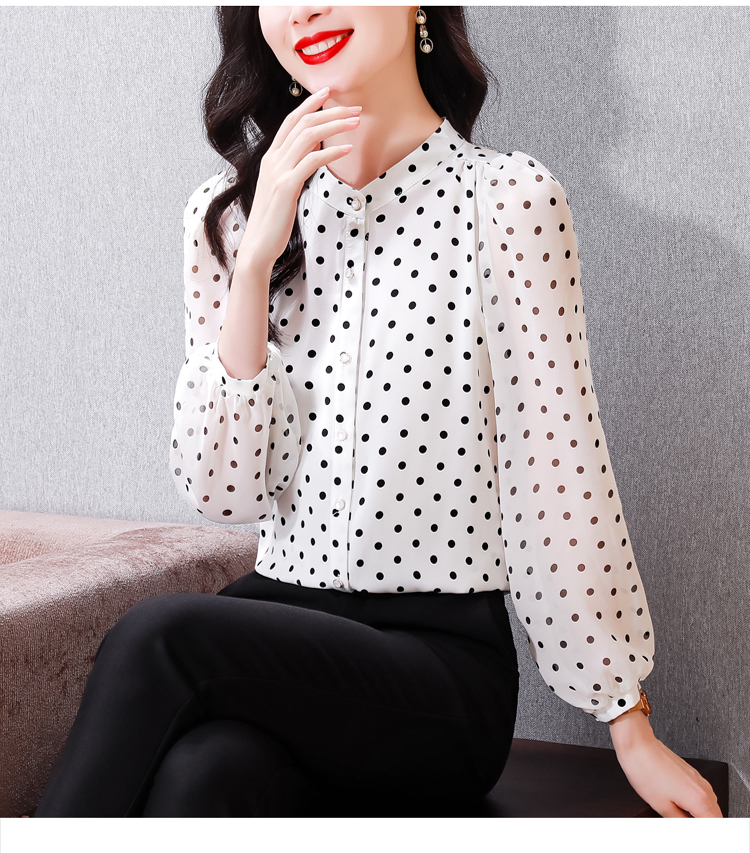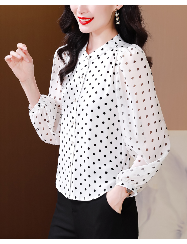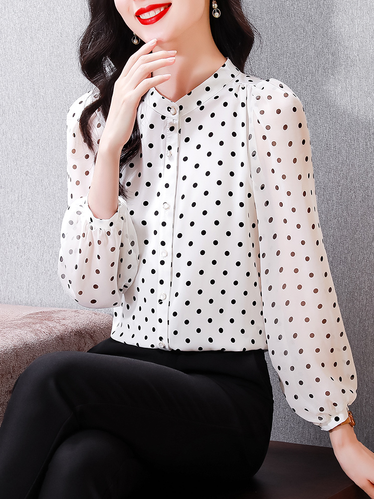 Mô tả :Áo sơ mi voan dài tay cổ đứng nữ mang phong cách thanh lịch, nhẹ nhàng và sang trọng. Thiết kế chấm bi tinh tế kết hợp cổ đứng giúp tôn lên vẻ duyên dáng và trẻ trung. Chất liệu voan cao cấp mềm mại, thoáng mát. Kiểu dáng hiện đại, dễ phối đồ, giúp người mặc vừa thời trang vừa giảm tuổi hiệu quả.