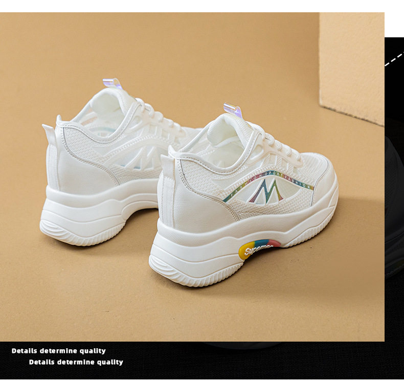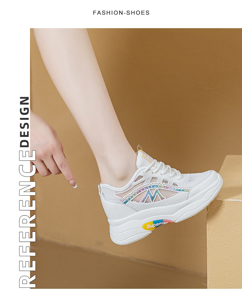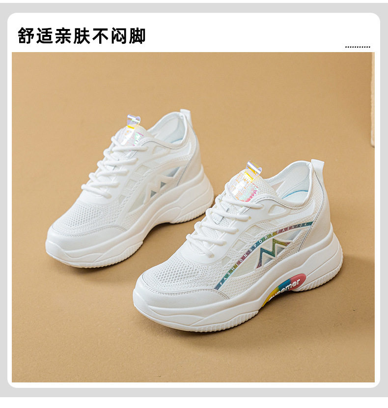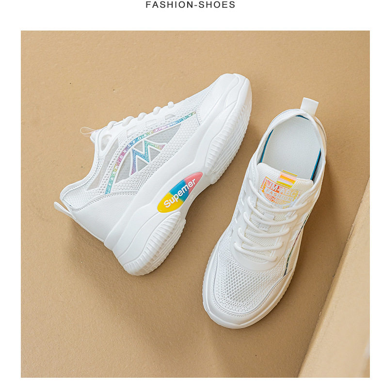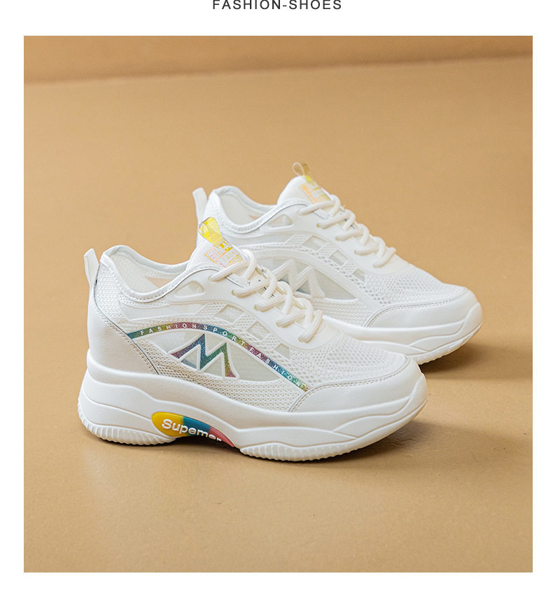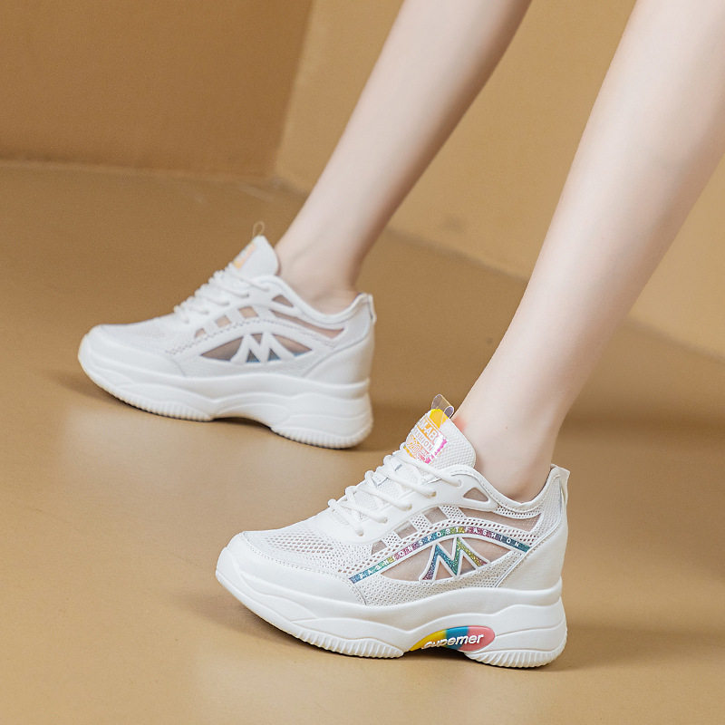 Mô tả :Giày thể thao nữ tăng chiều cao 8cm màu trắng, thiết kế phần trên bằng lưới thoáng khí mỏng nhẹ, mang lại cảm giác êm ái và dễ chịu khi di chuyển, phù hợp cho các hoạt động thể thao mùa hè và sử dụng hằng ngày.