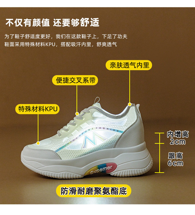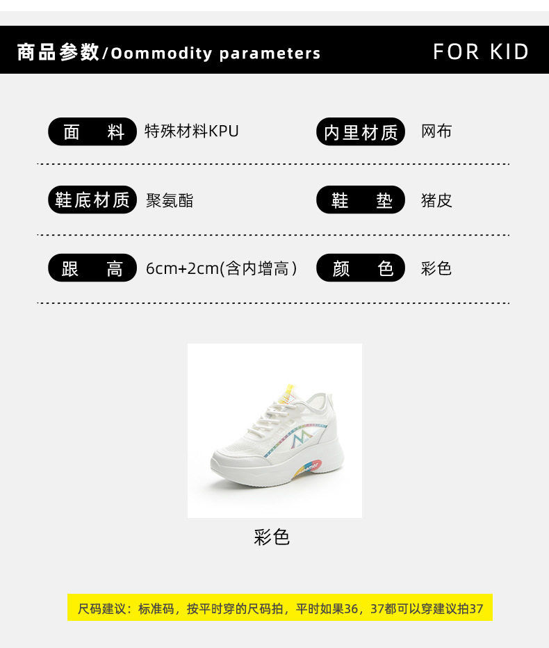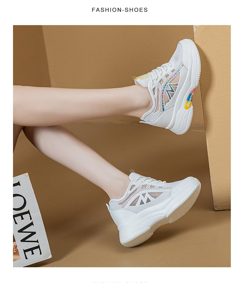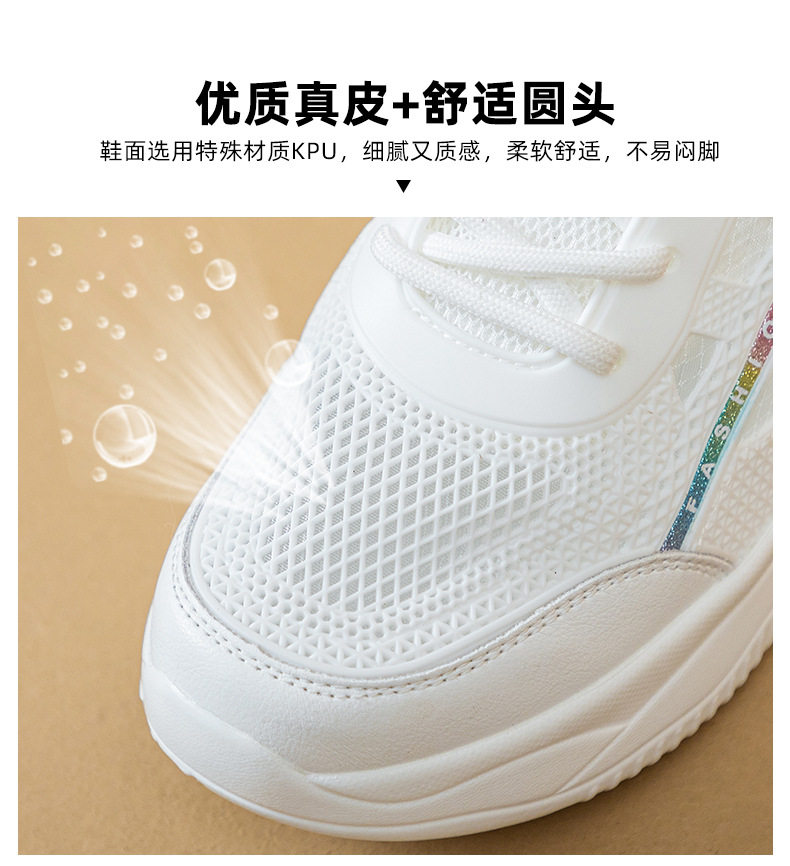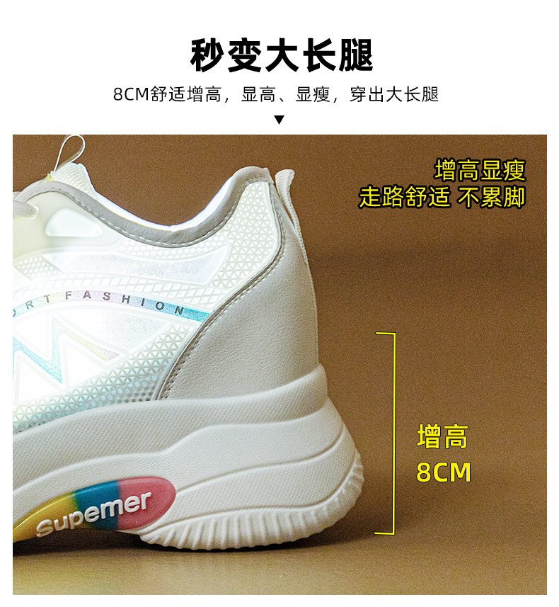 Mô tả :Giày thể thao nữ tăng chiều cao 8cm màu trắng, thiết kế phần trên bằng lưới thoáng khí mỏng nhẹ, mang lại cảm giác êm ái và dễ chịu khi di chuyển, phù hợp cho các hoạt động thể thao mùa hè và sử dụng hằng ngày.
