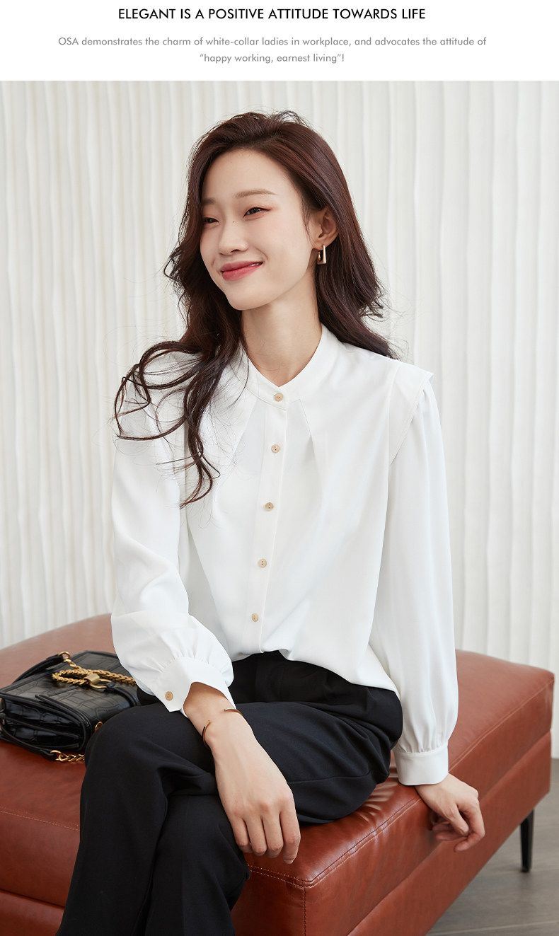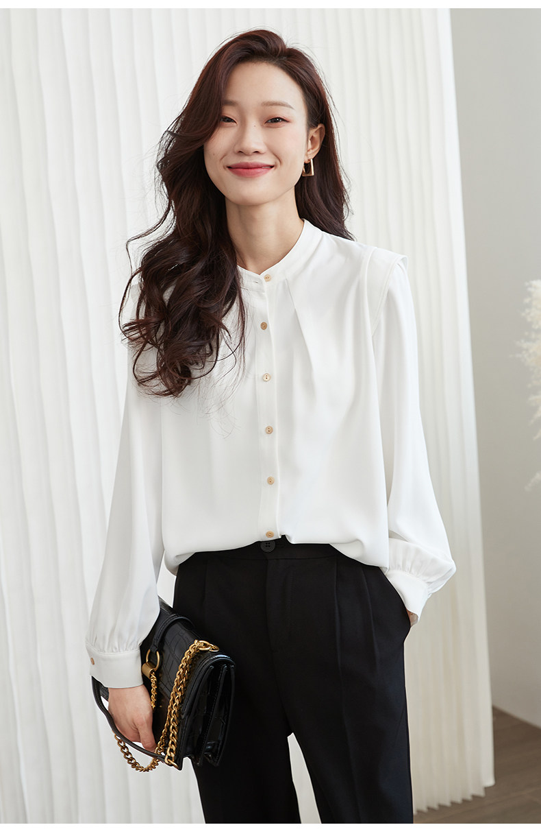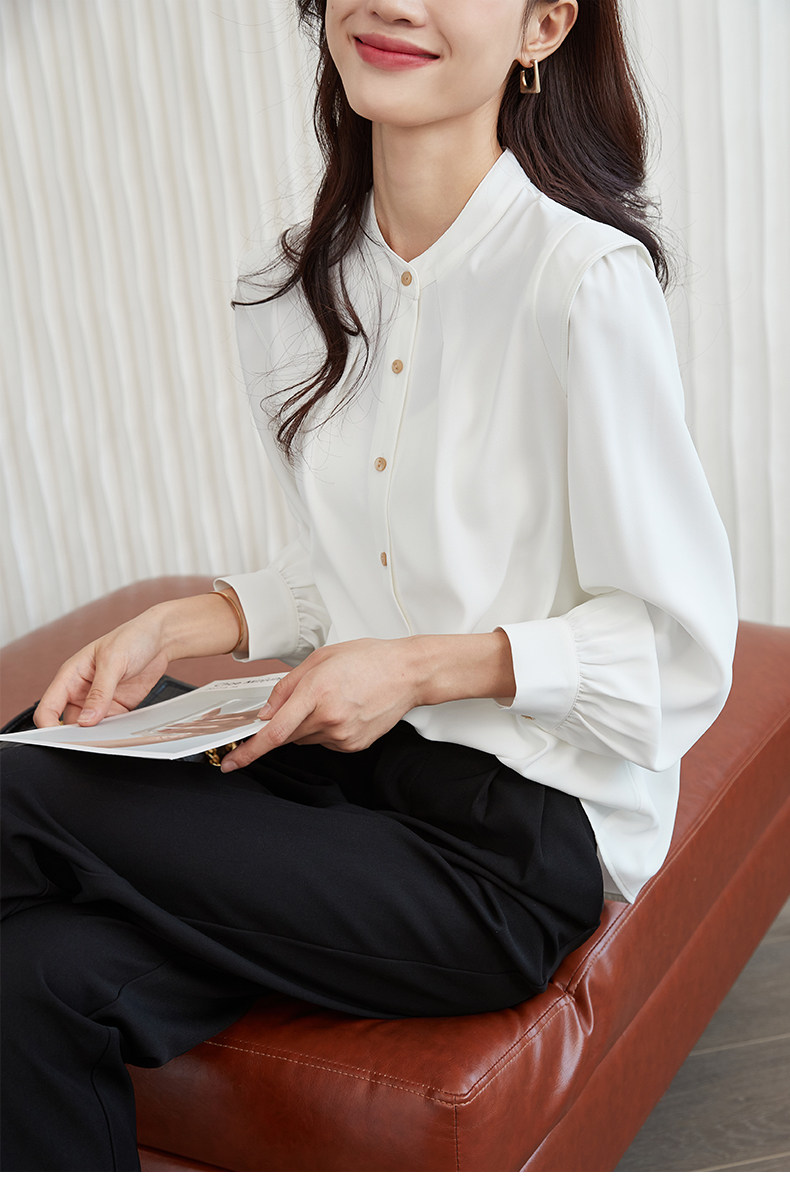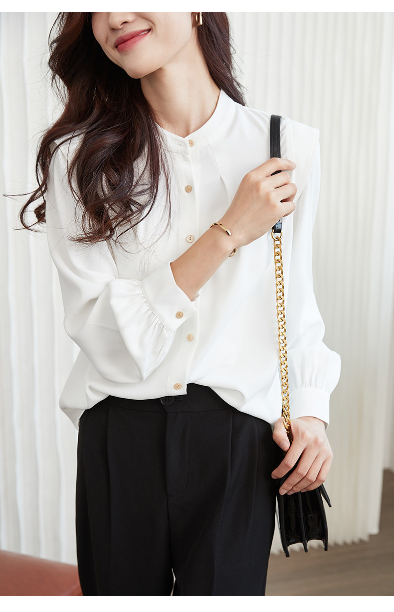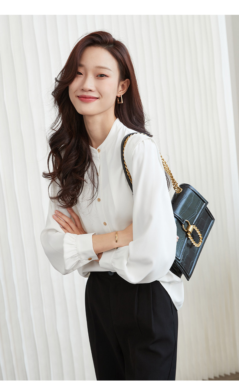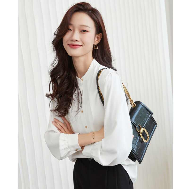Mô tả :Áo sơ mi chiffon cổ đứng kiểu Pháp mang vẻ đẹp thanh lịch và tinh tế. Thiết kế dáng rộng giúp tạo cảm giác thoải mái, đồng thời tôn lên nét nhẹ nhàng, nữ tính. Phần tay dài phồng là điểm nhấn độc đáo, mang hơi hướng cổ điển nhưng vẫn hiện đại. Chất liệu chiffon mềm mại, bay nhẹ theo từng chuyển động, tạo sự duyên dáng khi mặc. Tông màu trắng trang nhã giúp dễ dàng phối cùng nhiều trang phục khác nhau, từ công sở đến dạo phố.