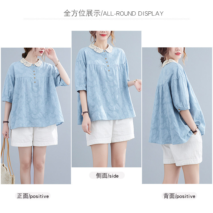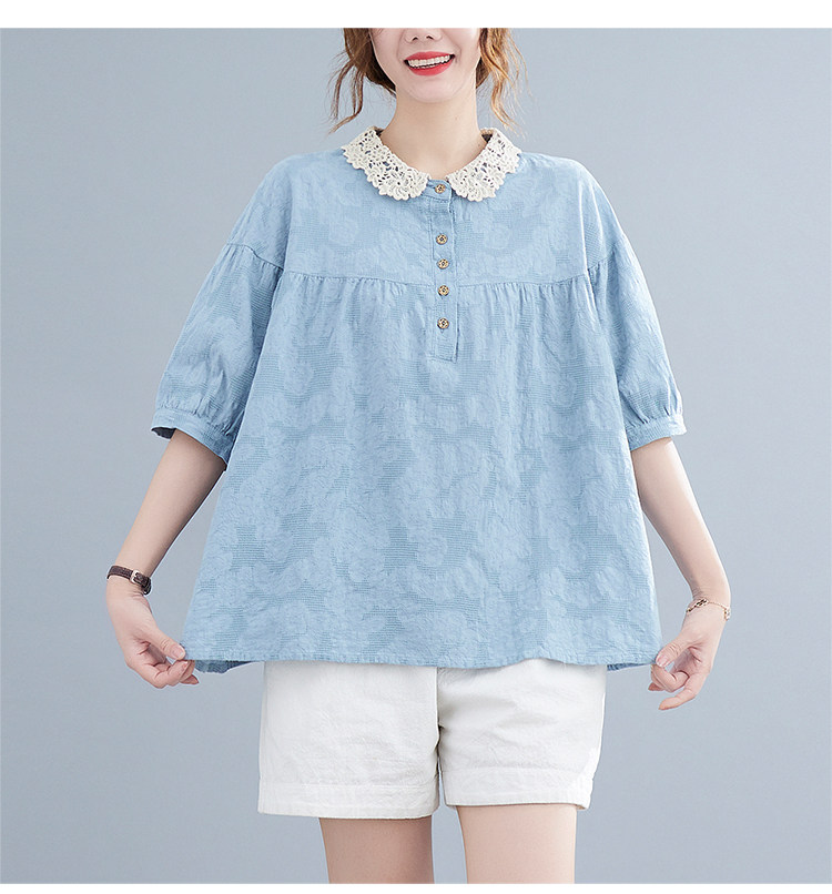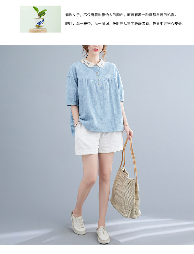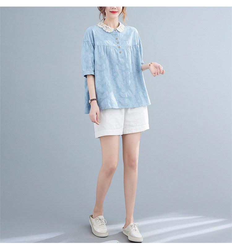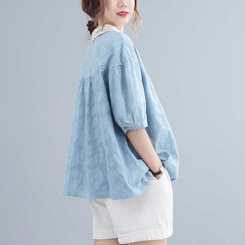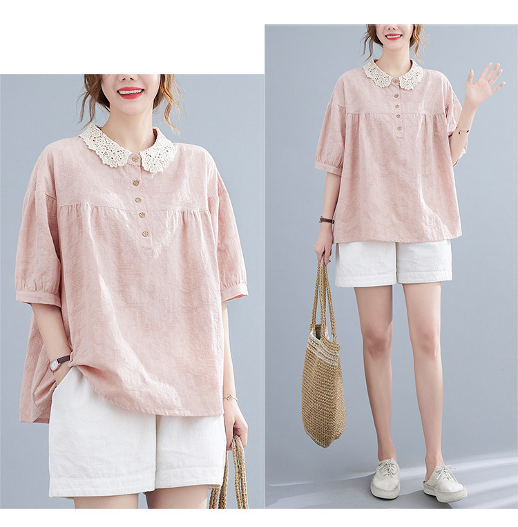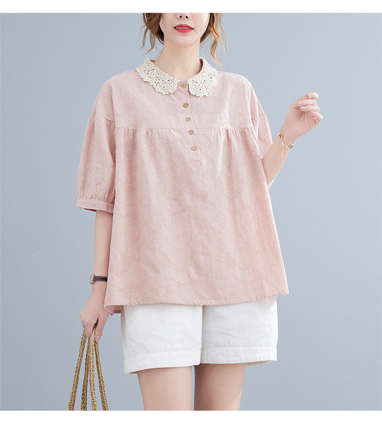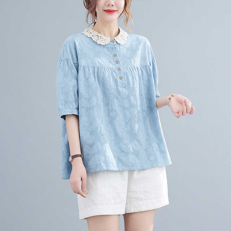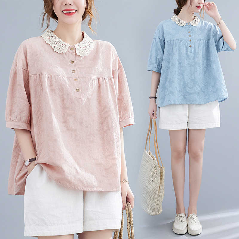 Mô tả :Hàng giá hời với áo sơ mi nữ kiểu Hàn Quốc, thiết kế dáng rộng thoải mái và dễ mặc. Cổ Peter Pan phối ren tinh tế, mang lại vẻ ngọt ngào và thanh lịch. Chất liệu jacquard cao cấp với họa tiết chìm tạo điểm nhấn nhẹ nhàng trên nền màu trơn. Tay ngắn trẻ trung, phù hợp cho nhiều dịp từ đi học đến đi chơi. Item đơn giản nhưng vẫn nổi bật, dễ phối cùng nhiều phong cách khác nhau.