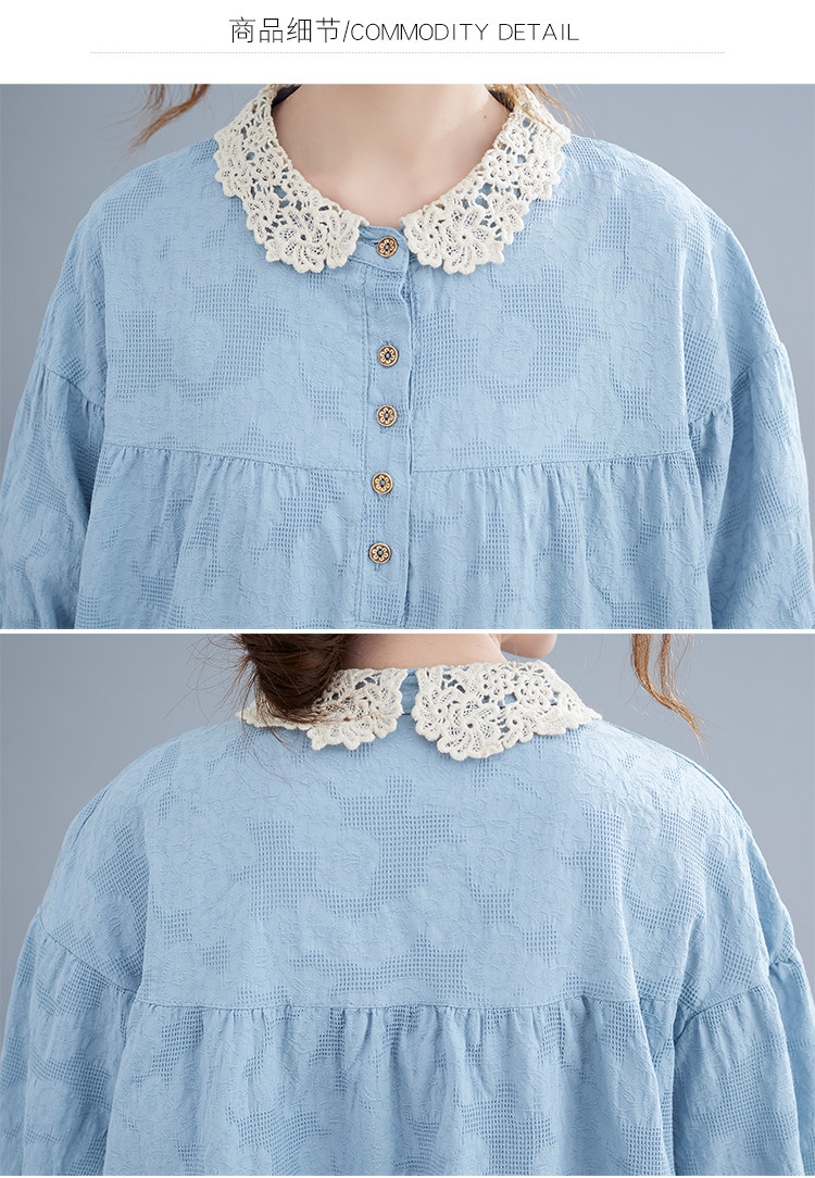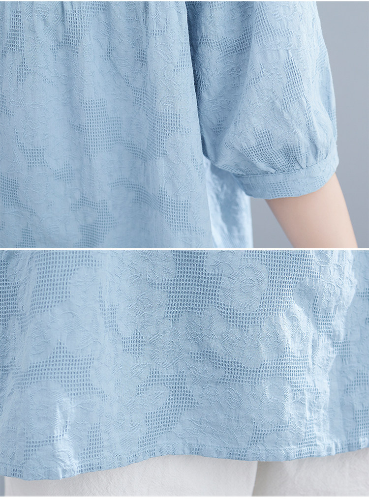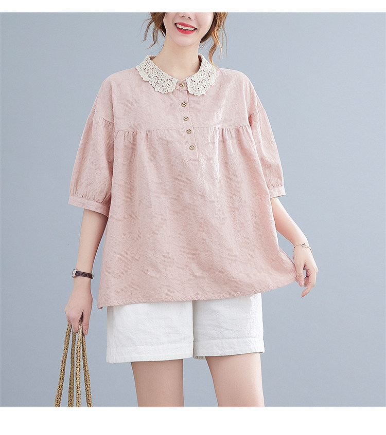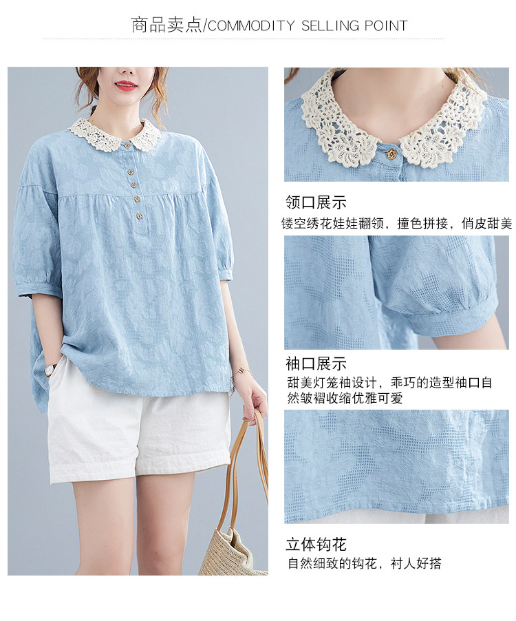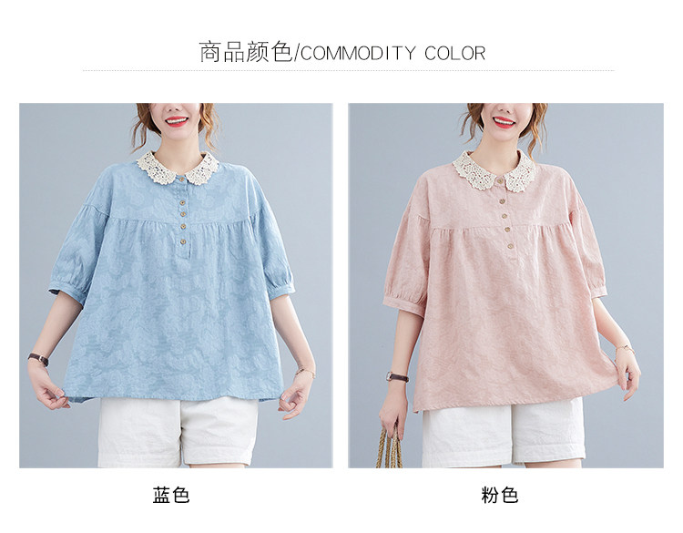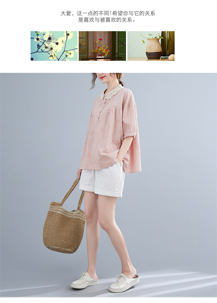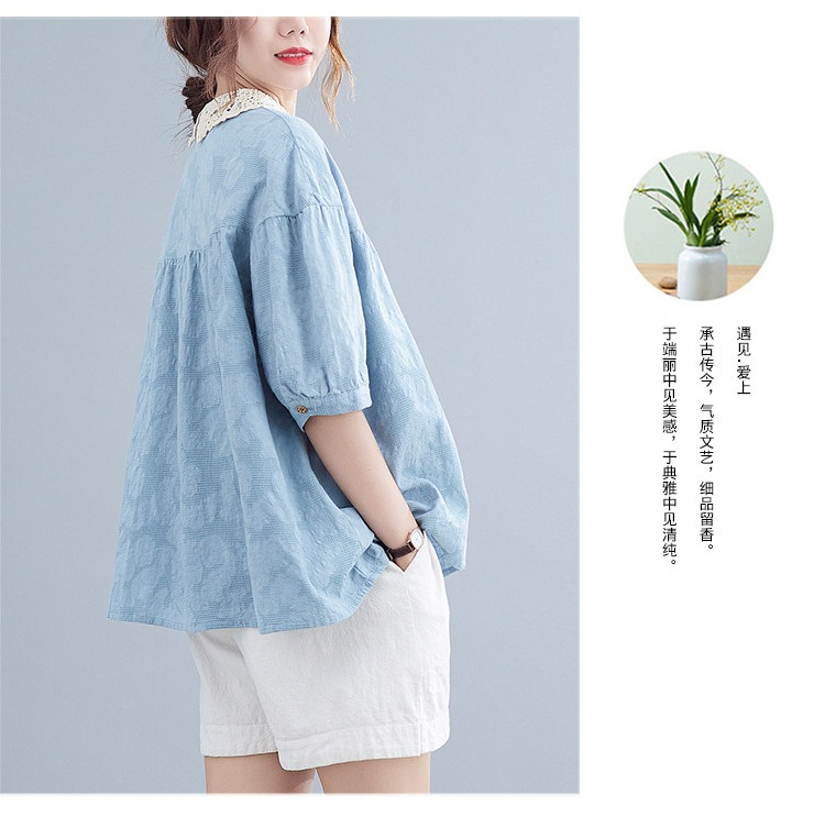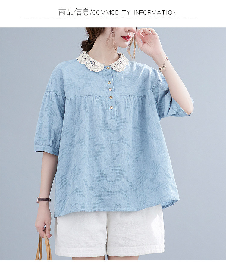 Mô tả :Hàng giá hời với áo sơ mi nữ kiểu Hàn Quốc, thiết kế dáng rộng thoải mái và dễ mặc. Cổ Peter Pan phối ren tinh tế, mang lại vẻ ngọt ngào và thanh lịch. Chất liệu jacquard cao cấp với họa tiết chìm tạo điểm nhấn nhẹ nhàng trên nền màu trơn. Tay ngắn trẻ trung, phù hợp cho nhiều dịp từ đi học đến đi chơi. Item đơn giản nhưng vẫn nổi bật, dễ phối cùng nhiều phong cách khác nhau.