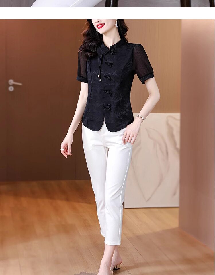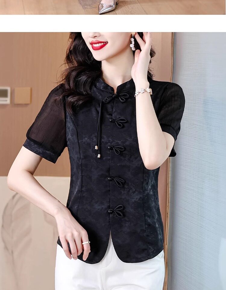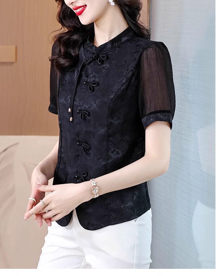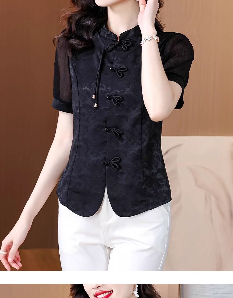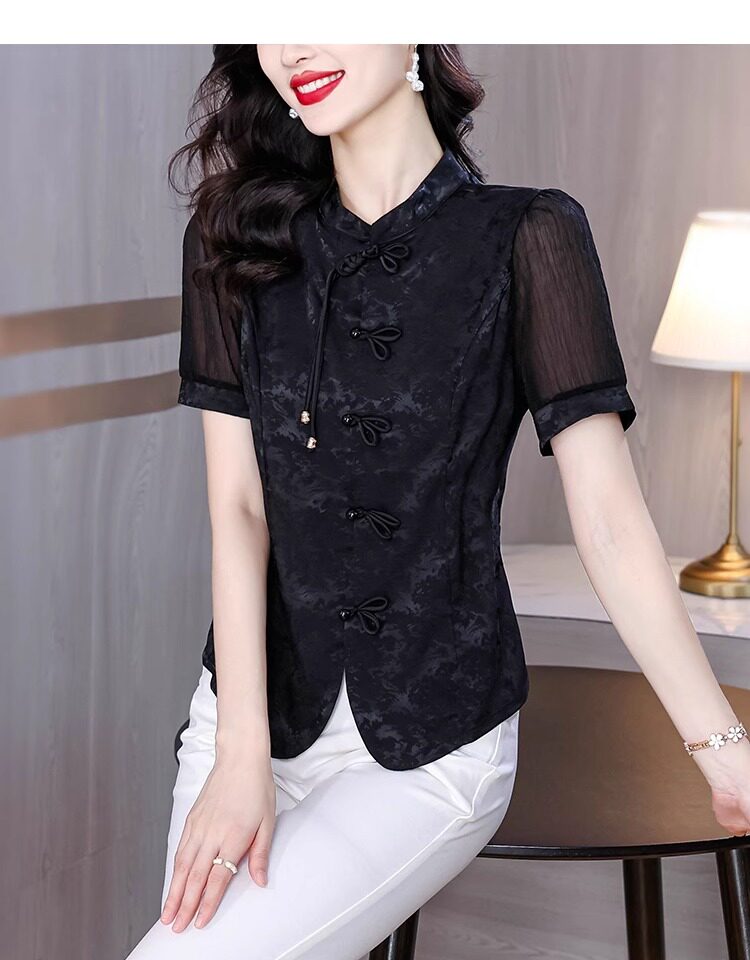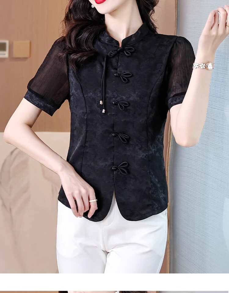 Mô tả :Áo sơ mi nữ tay ngắn màu đen được may từ chất liệu chiffon nhẹ nhàng, mang lại cảm giác thoáng mát. Thiết kế lấy cảm hứng từ sườn xám cải tiến, với đường cắt tinh tế tôn dáng và vẻ đẹp thanh lịch Á Đông. Phom áo hiện đại giúp dễ dàng phối cùng nhiều trang phục khác nhau. Chi tiết cổ và khuy cách điệu tạo điểm nhấn độc đáo nhưng vẫn giữ nét trang nhã. Phù hợp cho cả đi làm lẫn dạo phố với phong cách nhẹ nhàng, cuốn hút.