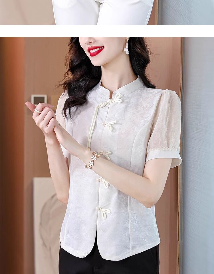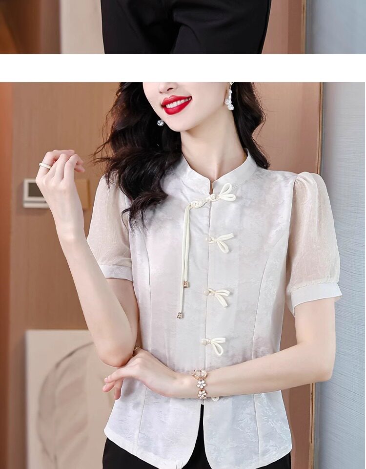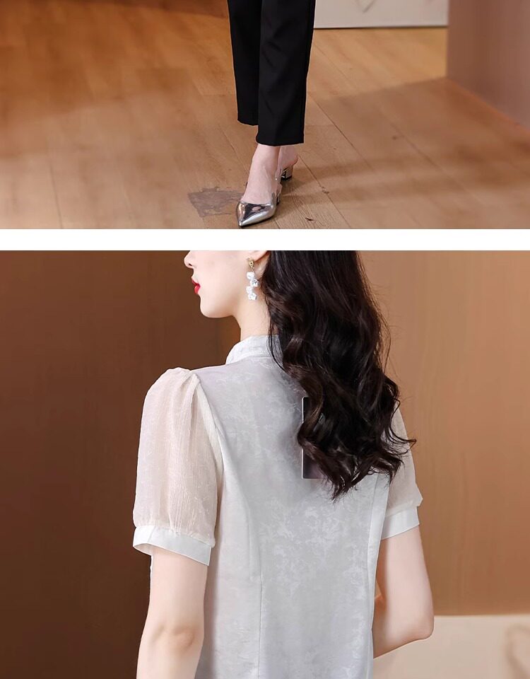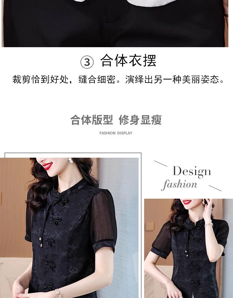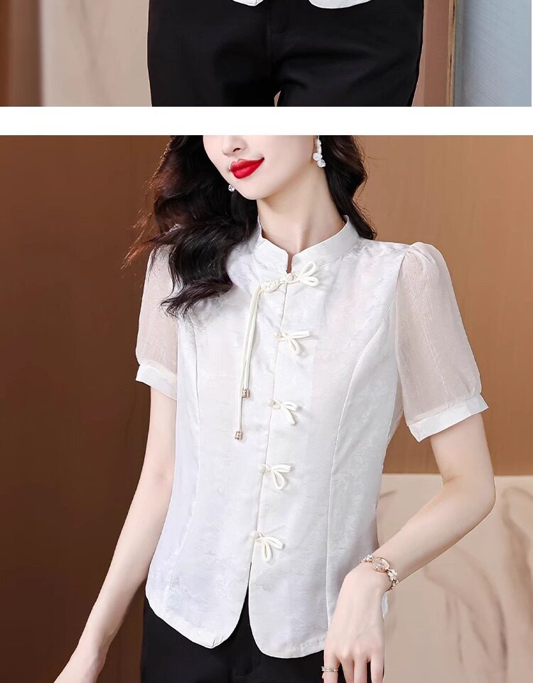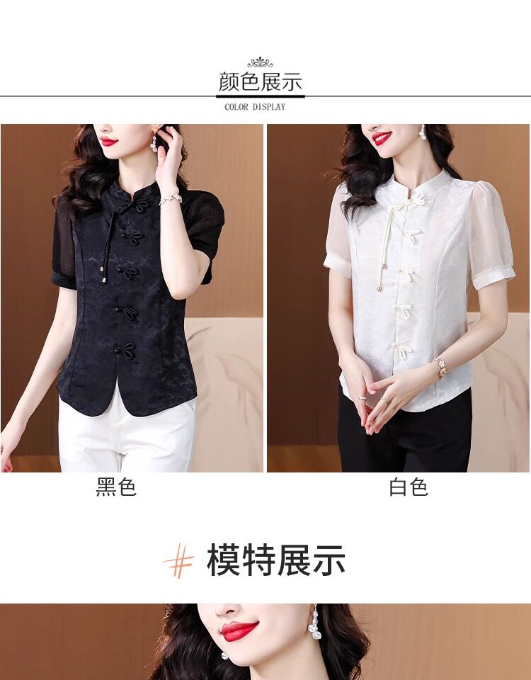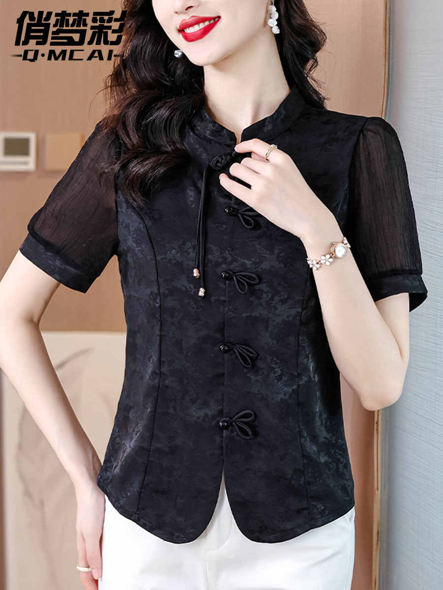 Mô tả :Áo sơ mi nữ tay ngắn màu đen được may từ chất liệu chiffon nhẹ nhàng, mang lại cảm giác thoáng mát. Thiết kế lấy cảm hứng từ sườn xám cải tiến, với đường cắt tinh tế tôn dáng và vẻ đẹp thanh lịch Á Đông. Phom áo hiện đại giúp dễ dàng phối cùng nhiều trang phục khác nhau. Chi tiết cổ và khuy cách điệu tạo điểm nhấn độc đáo nhưng vẫn giữ nét trang nhã. Phù hợp cho cả đi làm lẫn dạo phố với phong cách nhẹ nhàng, cuốn hút.